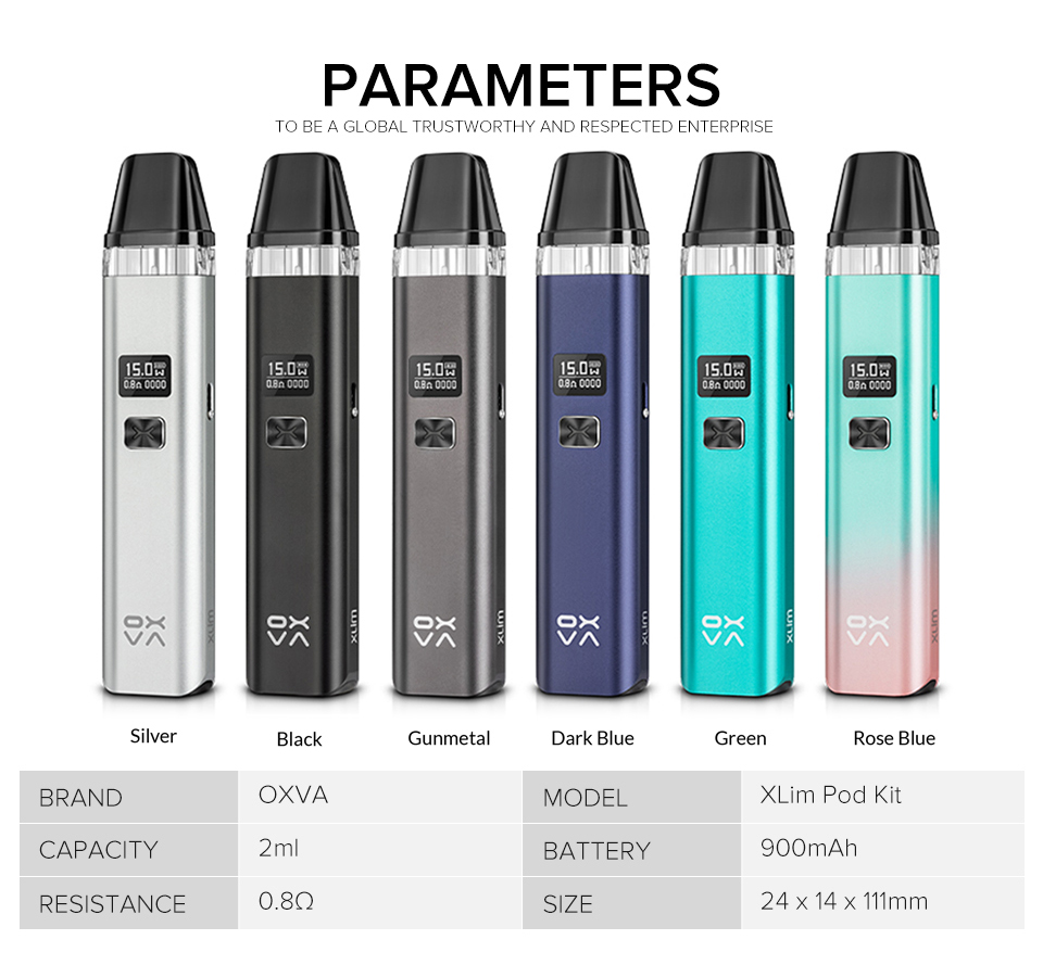 OXVA Xlim Pod System Kit, được làm bằng hợp kim nhôm & PCTG, là loại vỏ toàn diện nhất cho hương vị X-treme và âm thanh mạnh mẽ. OXVA Xlim Pod Kit hoạt động với pin 900 mah và đạt công suất lên đến 25W. OXVA Xlim sử dụng Màn hình Mini OLED 0,42 inch và Tự động vẽ & Đánh lửa bằng tay. Hệ thống Xlim Pod hỗ trợ thiết kế kiểm soát luồng gió bên. OXVA Xlim có vỏ chống rò rỉ 2ml với thiết kế hình quả trám phía trên.